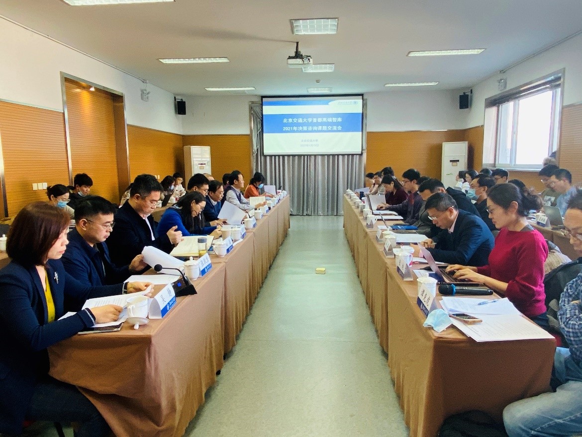为高质量完成北京市委市政府下达的2021年首都高端智库决策咨询课题研究任务,更好服务于市委市政府决策咨询,2022年1月13日下午在学校召开2021年度首都高端智库决策咨询课题交流会,会议邀请首都高端智库主管单位北京市社科联、市社科规划办智库工作部主任程文进,首都高端智库课题对接指导单位市委研究室城市处处长付承伟,市交通委综合规划处处长陈金川、研究室副主任徐晓燕、客运综合协调处副处长葛伟生、综合运输处副处长高磊、静态交通管理处王燕燕等部门领导参加座谈。会议由社科处副处长吴静主持。